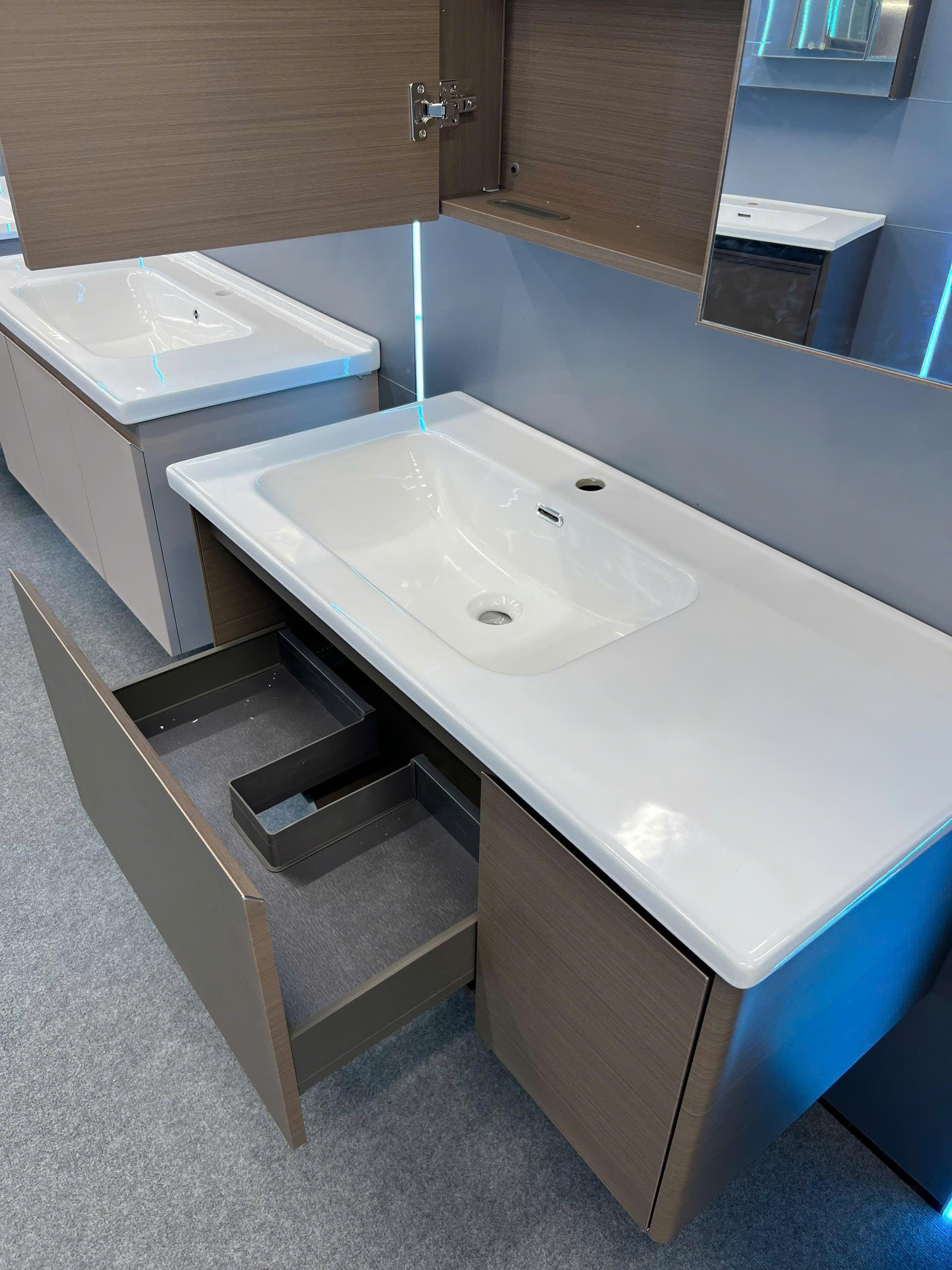 • Bộ sản phẩm bao gồm: Chậu lavabo, tủ dưới, tủ gương, vòi và bộ xi phông