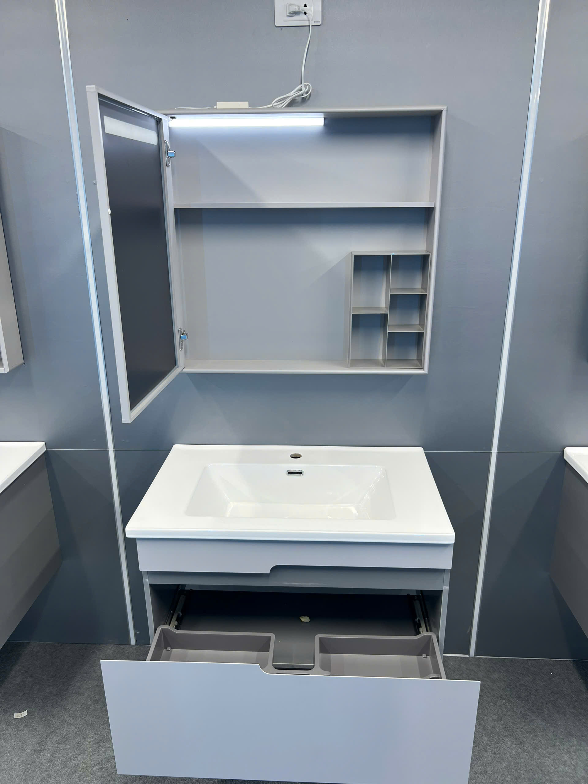 • Bộ sản phẩm bao gồm: Chậu lavabo, tủ dưới, tủ gương, vòi và bộ xi phông
